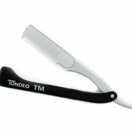 Profesjonalna brzytwa fryzjerska TONDEO MESSER TM posiada metalowy uchwyt oraz plastikową powłokę.