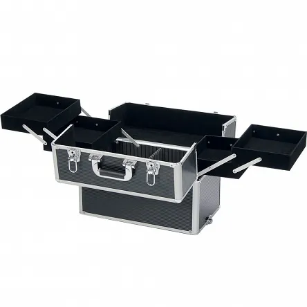 W pełni profesjonalny kufer fryzjerski Efalock BLACK MOLLY został wykonany z wysokiej jakości materiałów. Składa się z dwóch elementów. Na spodzie znajduje się duża i bardzo pojemna skrzynka, natomiast na górze kuferek z przegródkami wysuwanymi na boki.