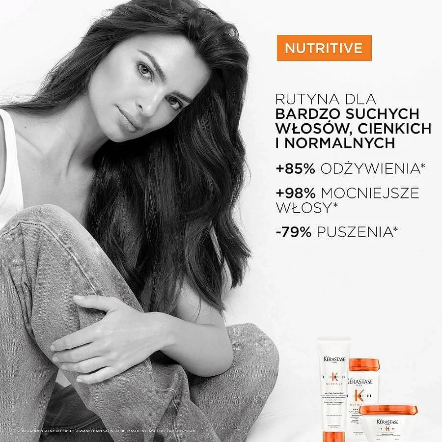 umyj włosy Kąpielą Kerastase Nutritive Bain Satin, a następnie na wilgotne nałóż Nektar termiczny Kerastase Nutritive Thermique. Potrzymaj ją około 3 minut, a następnie spłucz i dobrze wysusz. Po wysuszeniu zobaczysz, że twoje włosy są zregenerowane, nawilżone i lśniące.