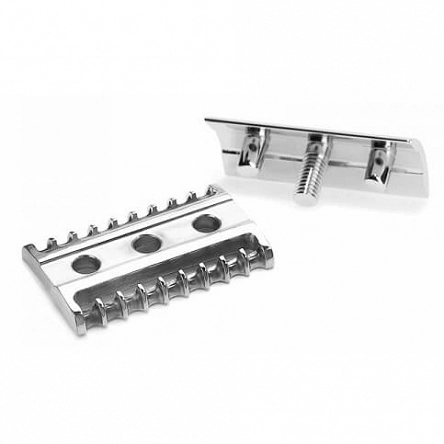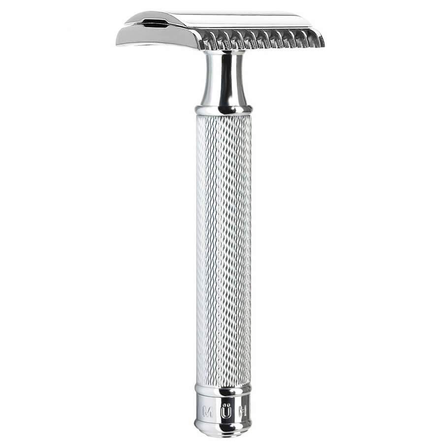 Maszynka do golenia na żyletki Muhle sprawdzi się wspaniale w przypadku gęstej brody i twardego zarostu. Zarost dostający się pod ostrze szybko mu ulega, ścięty nie zapycha przy tym głowicy, a to sprawia, że golenie jest szybsze i bardziej efektywne. Założenie konstrukcyjne ustawienia ostrza pod odpowiednim kątem w tym modelu pozwala na dynamiczną i bezpośrednią technikę golenia. Zakończenie dolnej części głowicy kształtem przypomina grzebień, dzięki czemu umożliwia rozczesanie i naciągnięcie włosów zarostu w momencie golenia, by uczynić je sprawniejszym. Uchwyt został wykonany z metalu, a jego ozdobą są metalowe elementy. Ten model pozwala na agresywne golenie – to za sprawą wielkości szczeliny pomiędzy żyletką a dolną częścią głowicy. Ten model maszynki do golenia to produkt ekologiczny i wolny od plastiku – to znakomita alternatywa dla maszynek jednorazowych i maszynek do golenia na wkłady. Otwarty grzebień ułatwia również mycie maszynki po każdym goleniu. Otwarty grzebień ułatwia odprowadzanie ścinanego zarostu i piany poza ostrze żyletki. Metalowe elementy zostały wykonane z chromu – materiału odpornego na korodowanie, uszkodzenia mechaniczne i chemiczne. Maszynka do golenia na żyletki Muhle to model wyróżniający się otwartym grzebieniem i metalową rękojeścią.