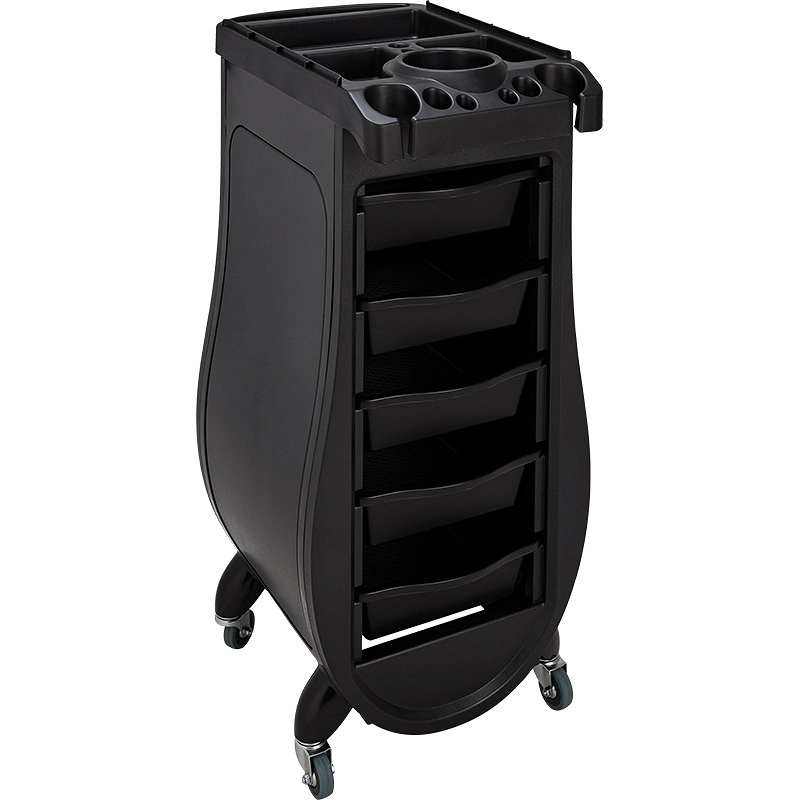 Pomocnik fryzjerski Ayala SIGNIORINA to prosty sposób na uporządkowanie przestrzeni wokół siebie. Teraz możesz mieć pod ręką wszystkie niezbędne akcesoria i narzędzia, które pomieścisz w pięciu zgrabnych szufladkach oraz rozłożysz na blacie pomocnika. Liczne przegródki sprawiają, że każda rzecz ma swoje miejsce, a Ty możesz odruchowo odkładać je na miejsce. Co więcej, pomocnik łatwo przesuniesz z miejsca na miejsce dzięki gumowym kółkom, które są wyjątkowo ciche. Pomocnik łatwo wyczyścić.
