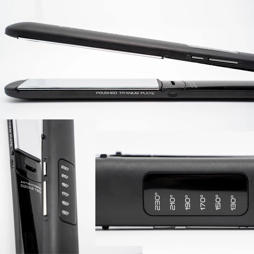 Płytki wykonane z polerowanego tytanu skutecznie prostują i jednocześnie są delikatne w kontakcie z włosami. Pływająca konstrukcja płytek pozwala na precyzyjne dopasowanie do pasma, co poprawia komfort stylizacji. Wbudowane technologie ION PLUS oraz OZONE wspierają pielęgnację – jony ułatwiają domknięcie łuski włosa, a ozon wspiera oczyszczanie i pomaga zadbać o dobrą kondycję skóry głowy. Regulacja temperatury w zakresie od 130°C do 230°C pozwala dostosować działanie do potrzeb różnych rodzajów włosów.