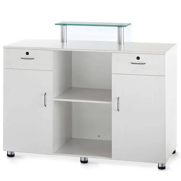 Recepcja Gabbiano Q-0733 jest wykonana z najwyższej jakości materiałów i doskonale wykończona. Znajdują się w niej dwie szafki, dwie szuflady oraz dwie dodatkowe półki, które pozwalają na optymalne wykorzystanie przestrzeni. Recepcja jest bardzo pojemna i pozwala na zachowanie porządku w salonie fryzjerskim. To mebel włoskiej jakości - funkcjonalny i elegancki.