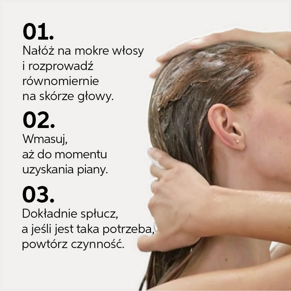 Szampon wmasować w mokre włosy i spienić. Dokładnie spłukać.